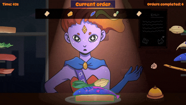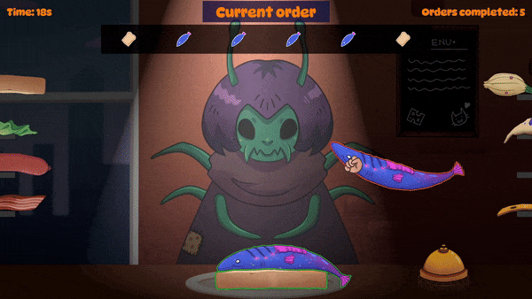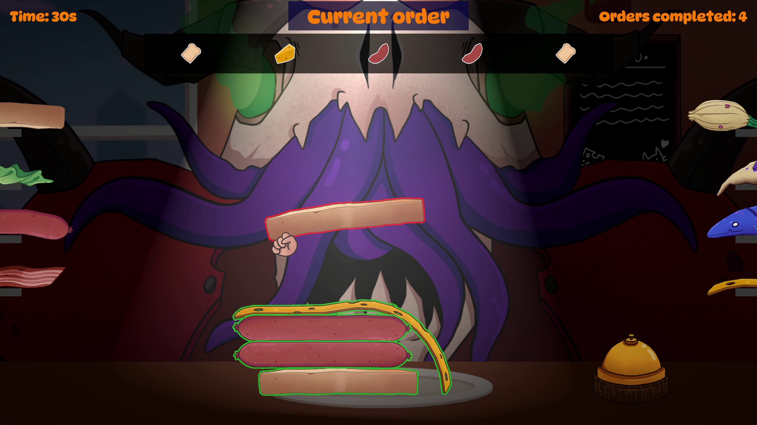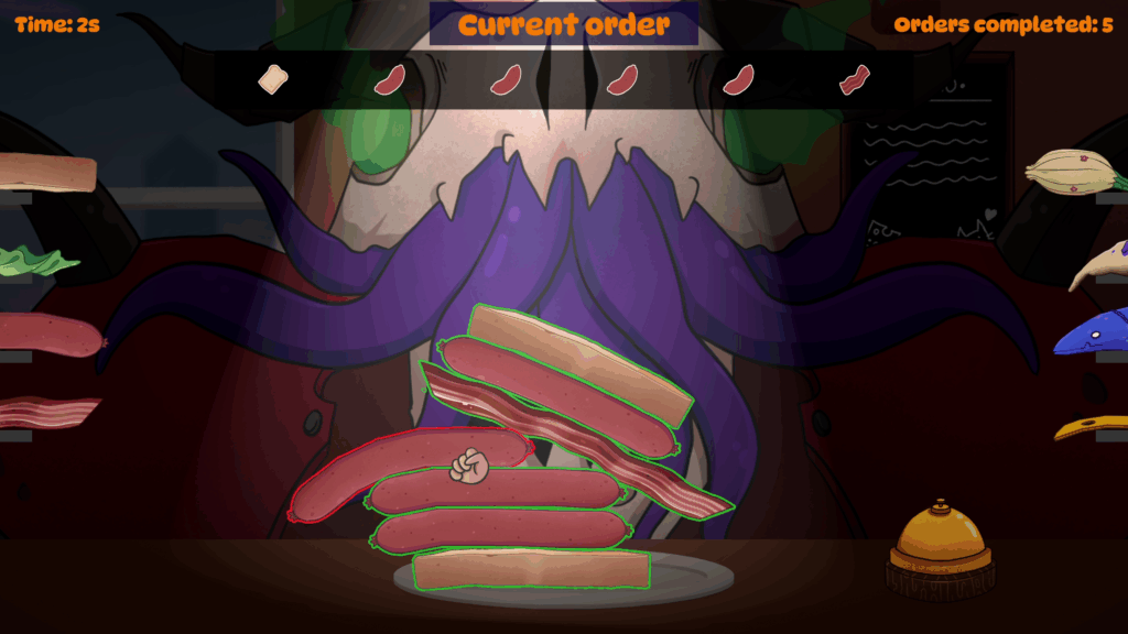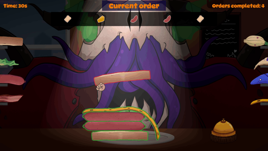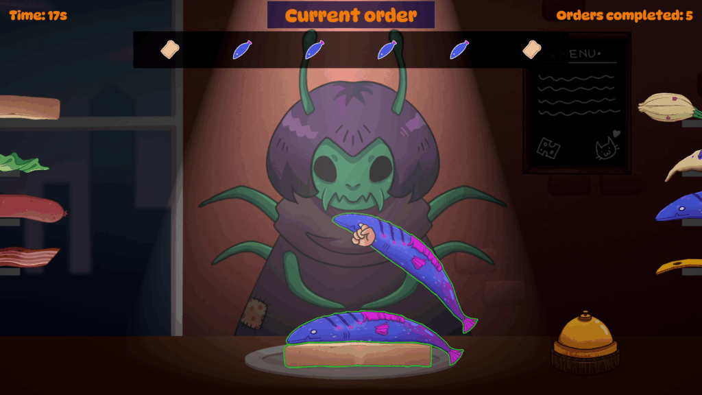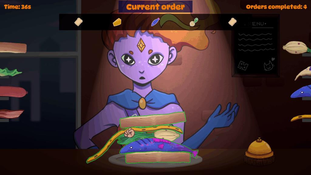 I took part in Nordic Game Jam 2025 where the themes were “Eat” vs. “Sleep”. Our team decided to use the “eat” theme and made a quirky physics-driven sandwich game in Unity where you have to serve monster customers who get more and more demanding.
