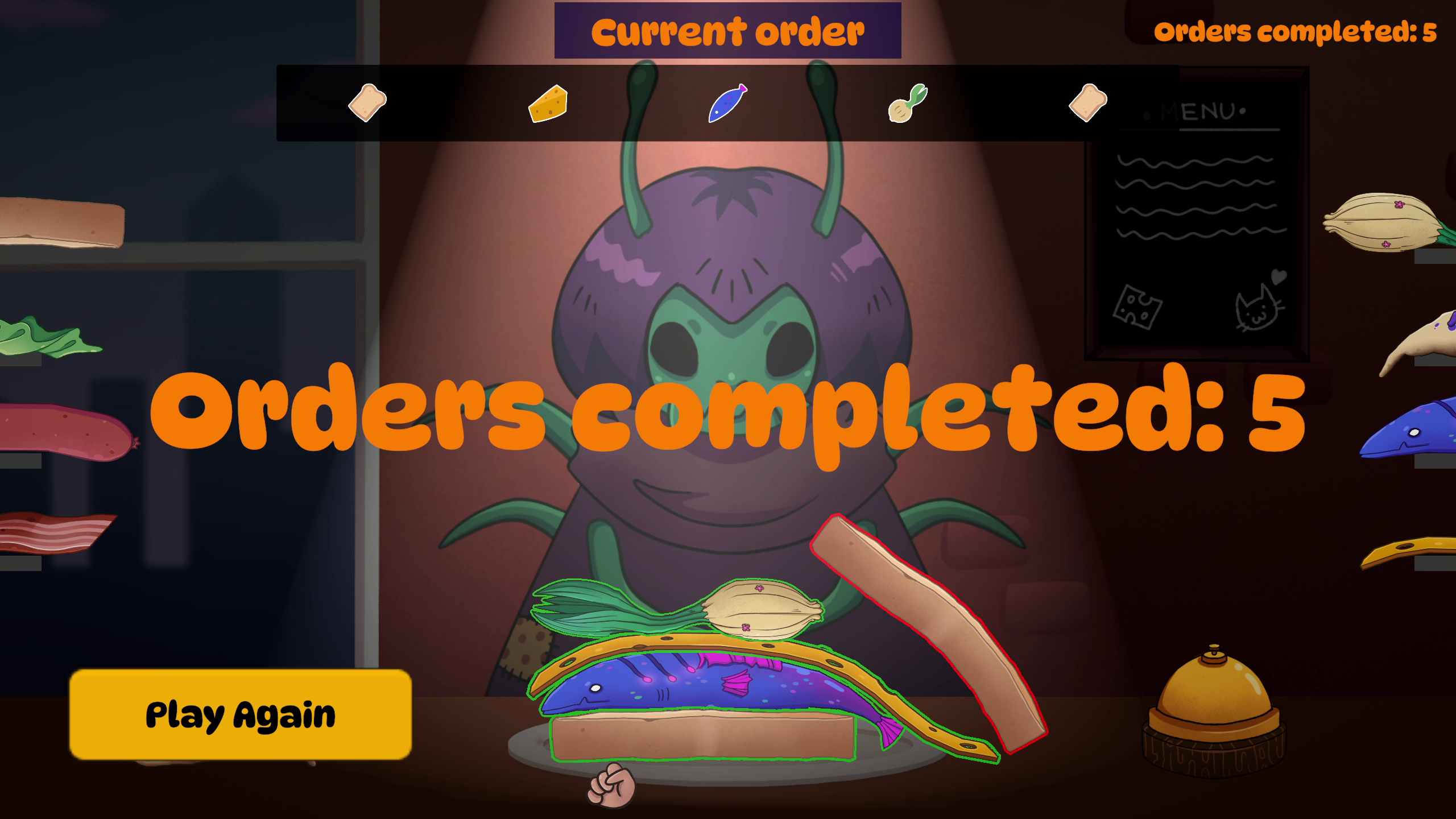 Physics-based sandwich builder game with weird monster customers.